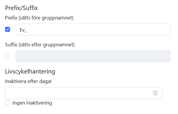 Namnsättningen är flexibel och har stöd för att sätta både ett prefix och suffix på grupper så att de enkelt kan identifieras i olika delar av M365.
