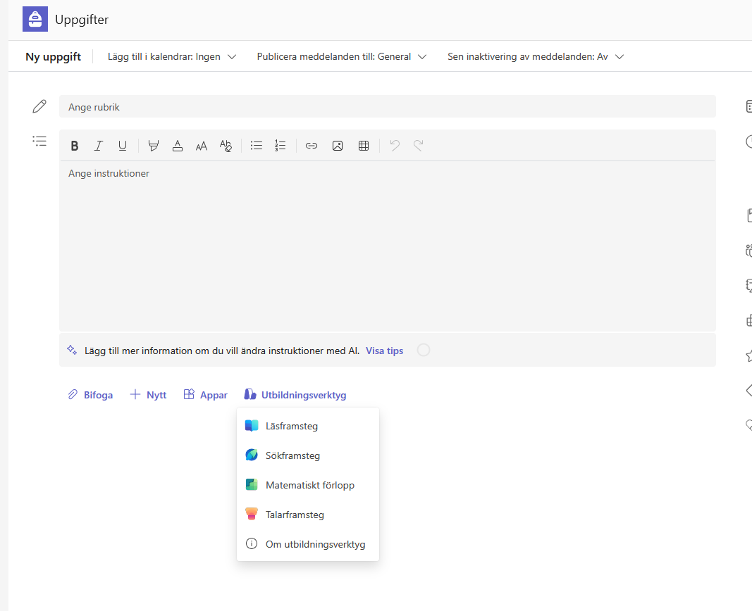 Microsoft utvecklar ständigt sina verktyg, och därför kan funktioner ibland byta plats. Tidigare kunde du hitta Läsframsteg (Reading Progress) direkt under "Bifoga" när du skapade eller redigerade en uppgift i Teams. Numera är det lite annorlunda.
